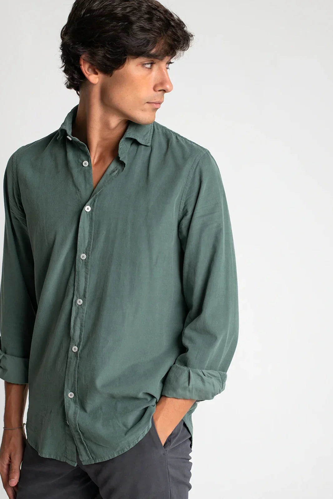 Camisa de micropana en verde con efecto lavado, con cuello sin botón.