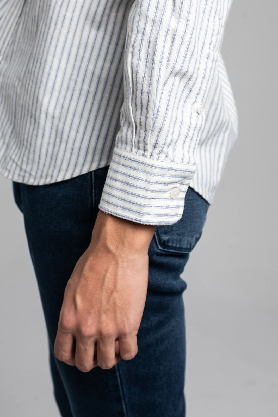Camisa de color hueso con una rayas en azul, en un tejido de viyela de algodón, con un tacto muy agradable.