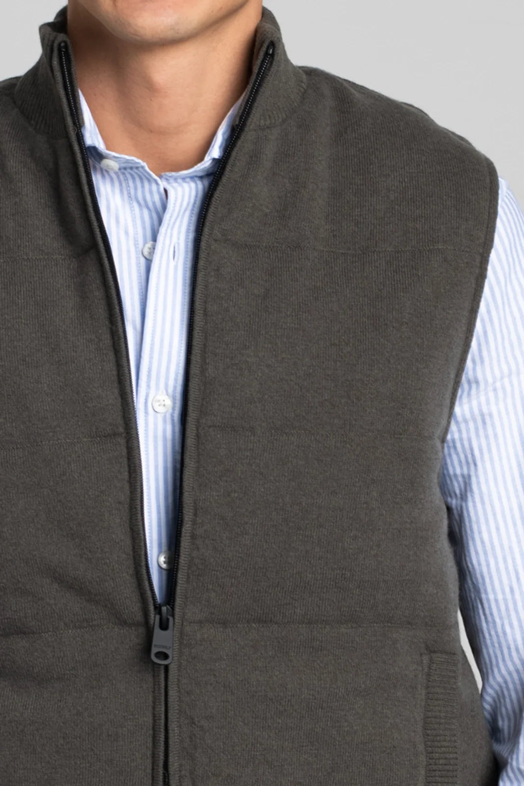 Chaleco acolchado con el exterior confeccionado en lana reciclada, con cuello chimenea y elástico en el bajo. De color verde caqui.
