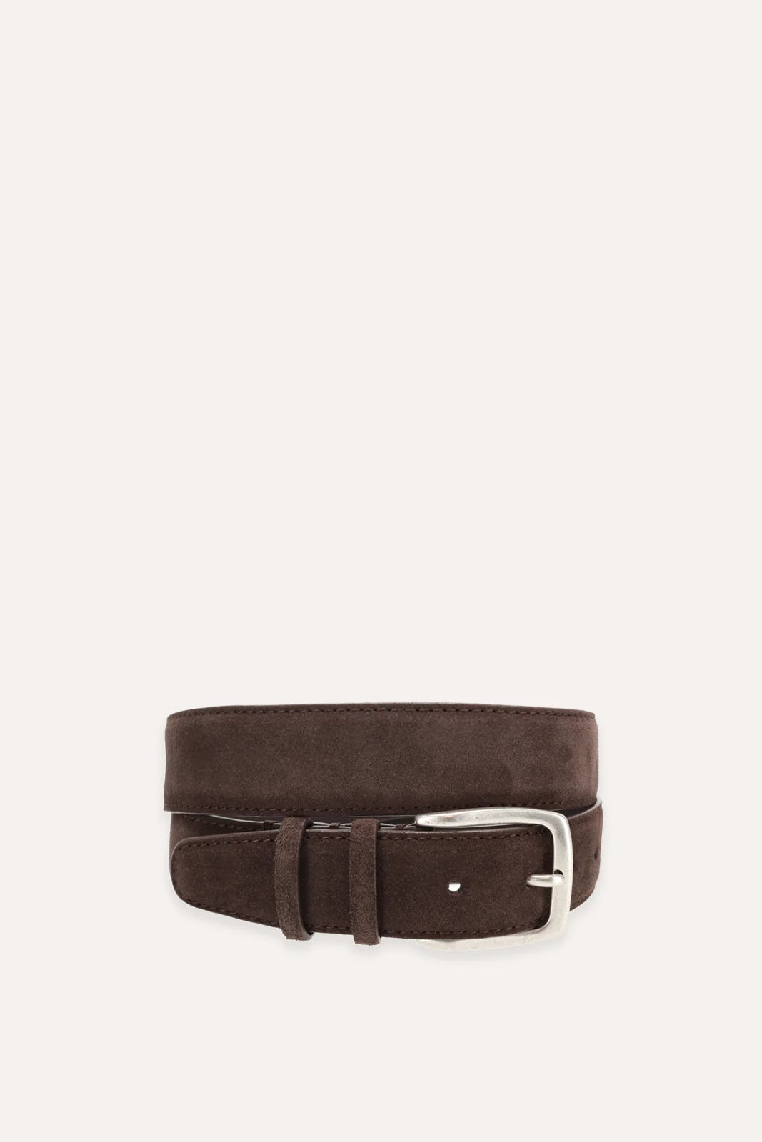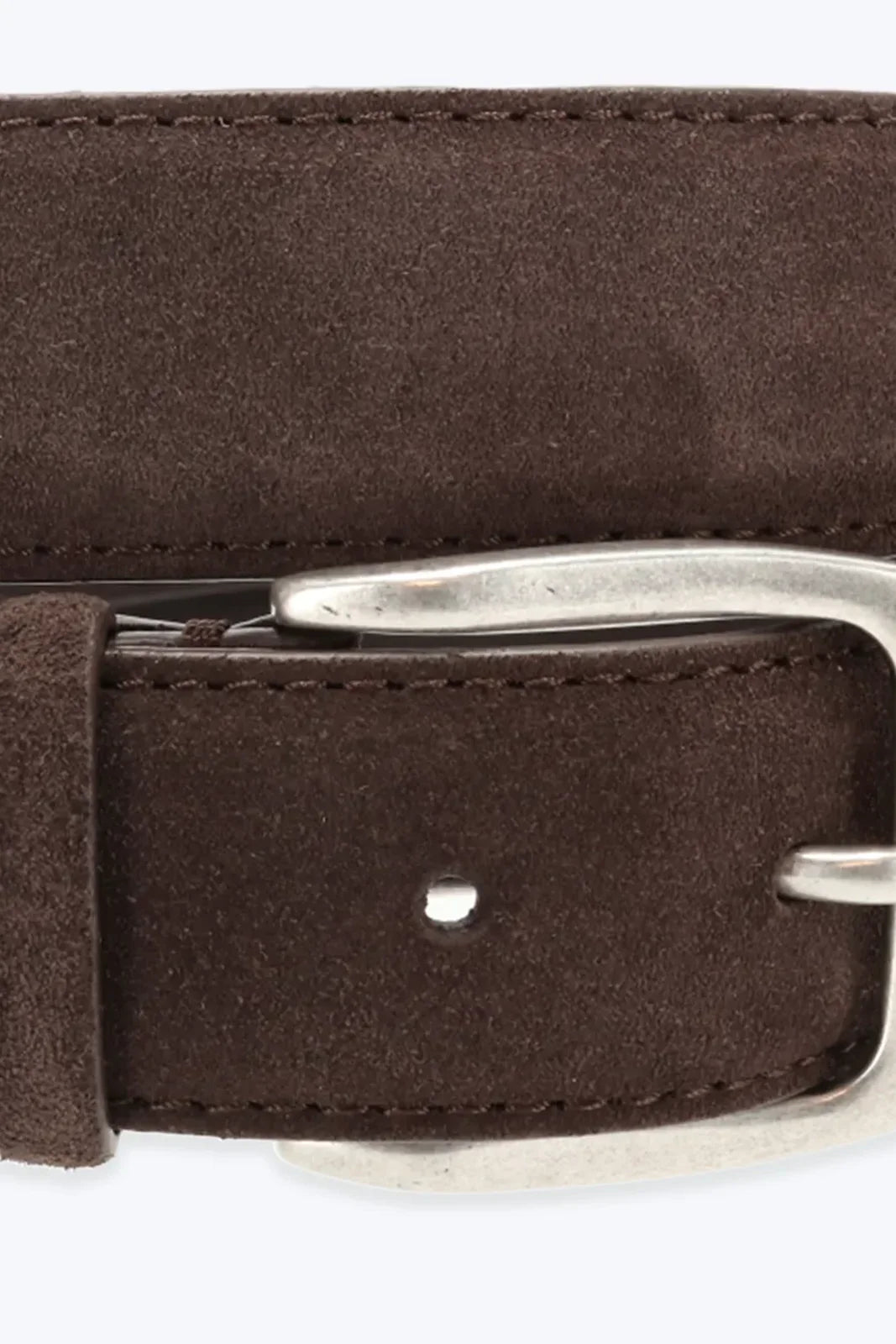 Cinturón liso de ante marrón oscuro con hebilla metálica color plata vieja.