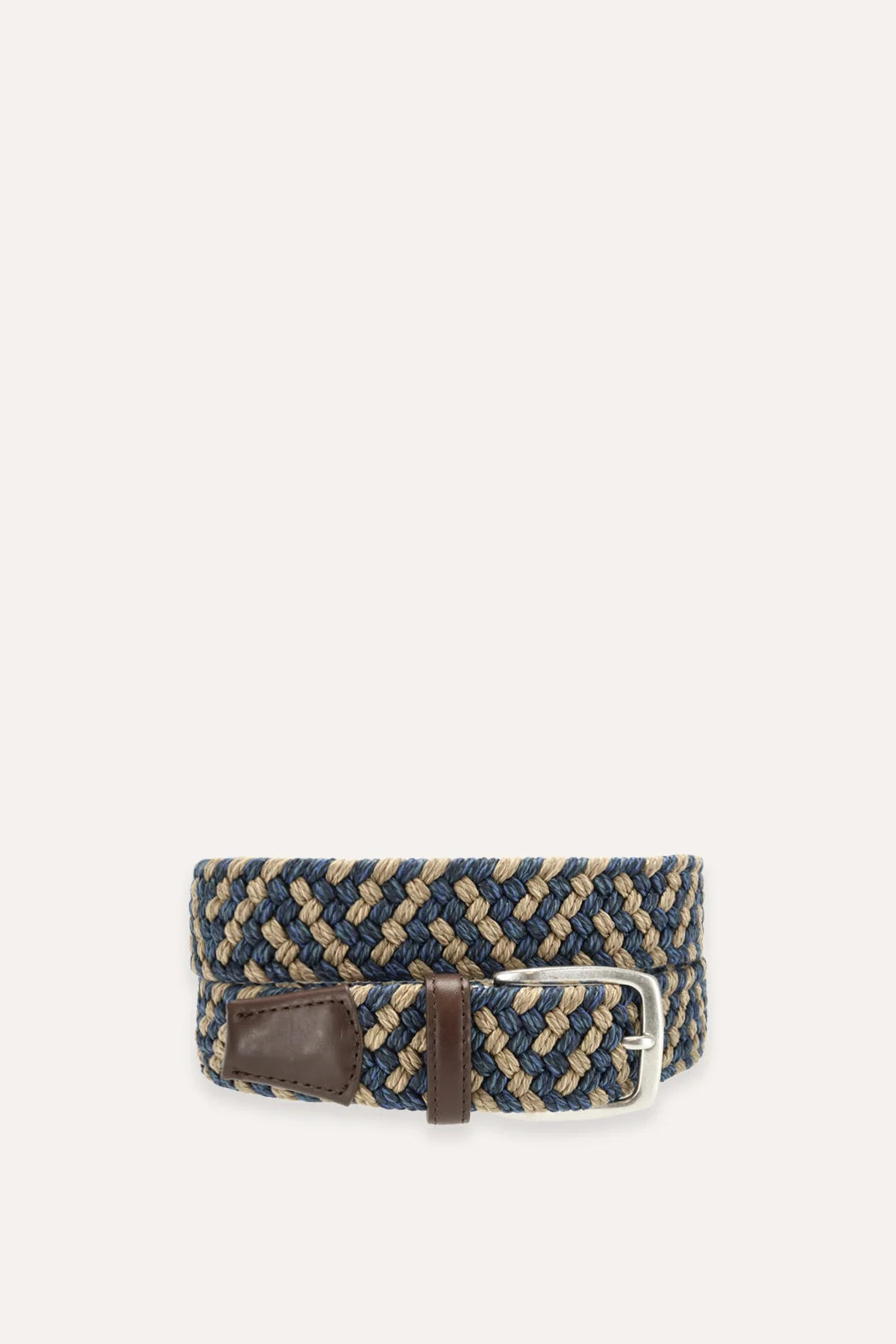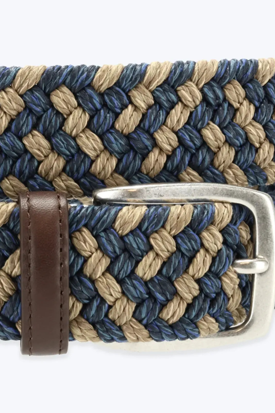 Cinturón elástico trenzado en cuerda en color combinado azul y beige.