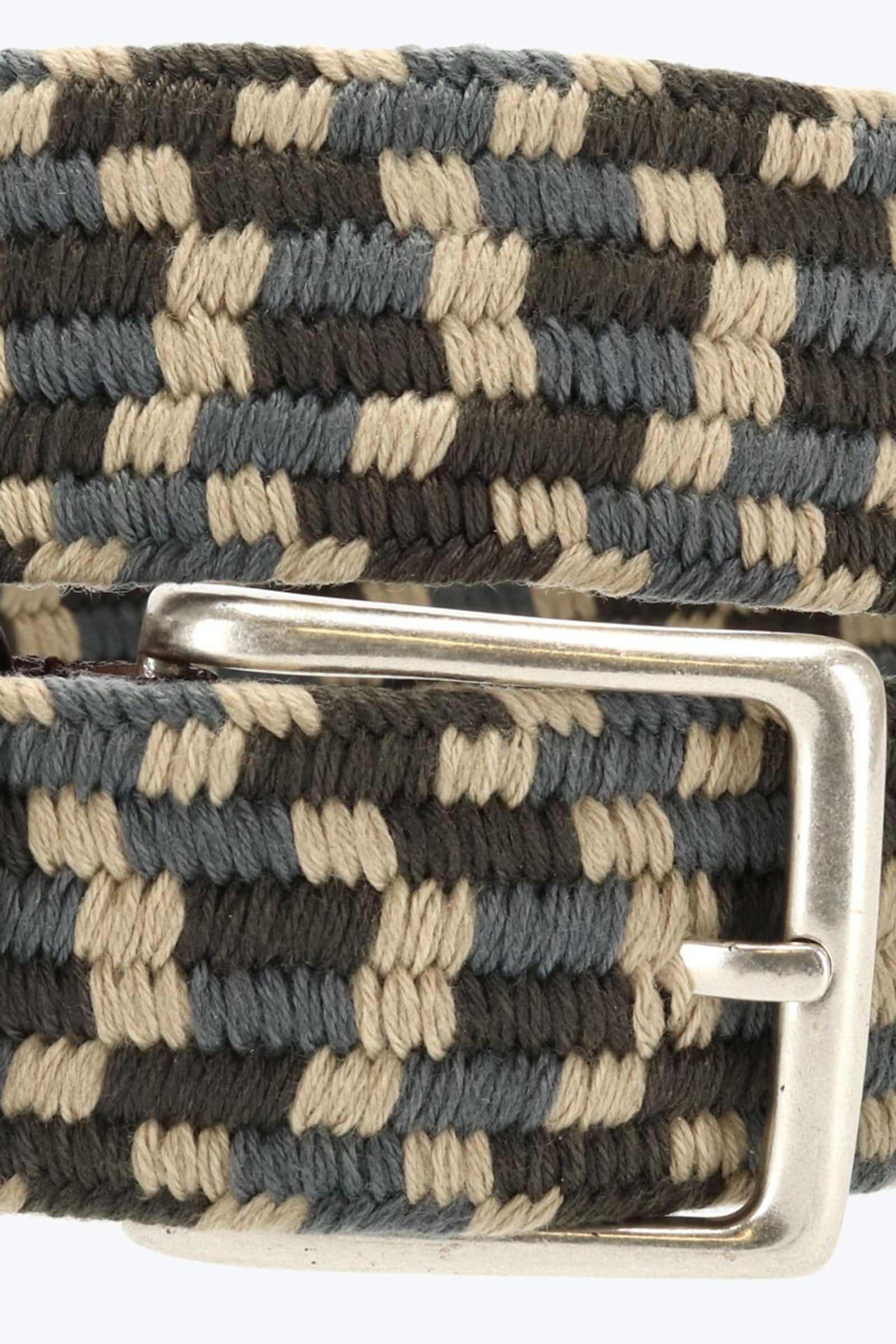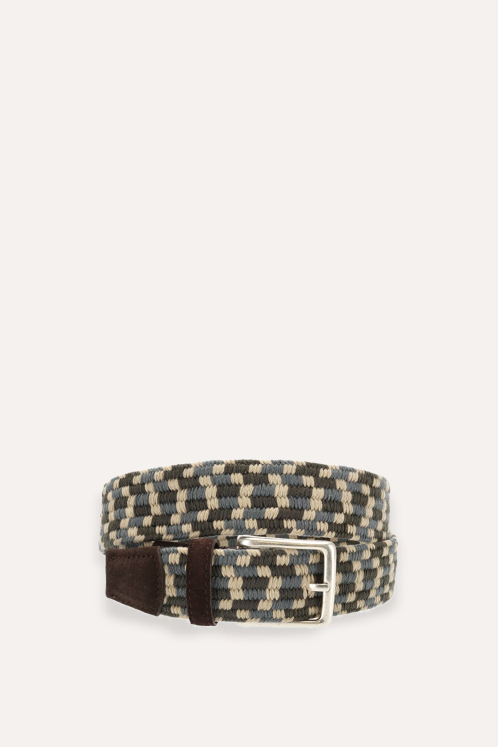 Cinturón elástico, trenzado en tonos marrón y beige. Punta y trabilla de ante marrón oscuro.