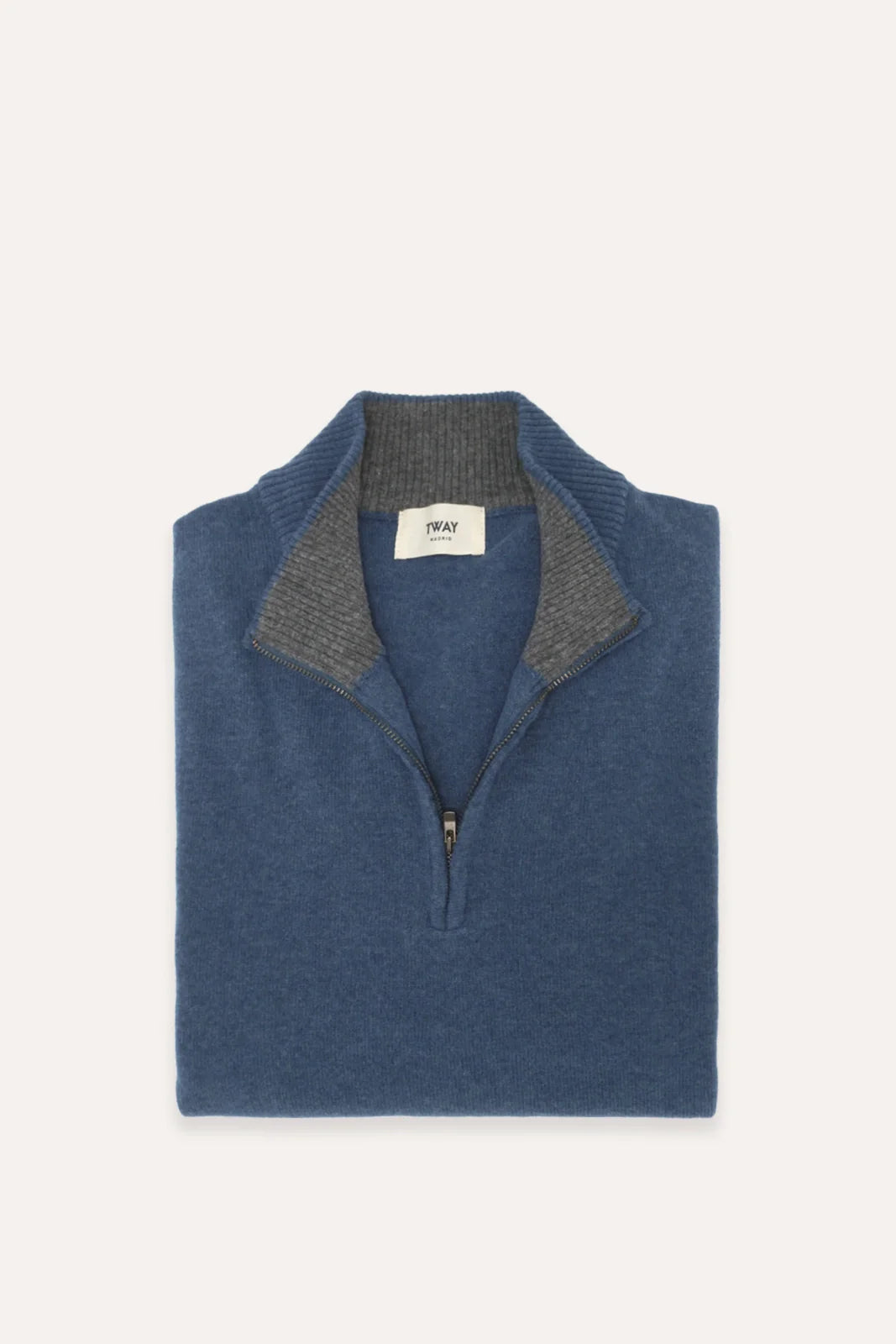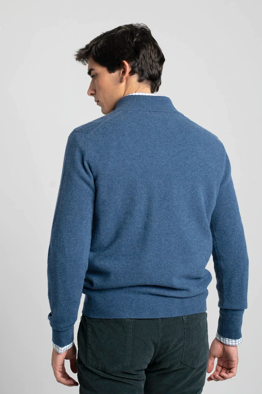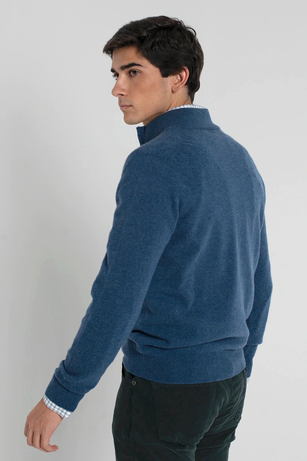 Jersey de lana con cuello chimenea y cremallera de un color azul que sienta muy bien. El interior del cuello esté tejido en gris oscuro.