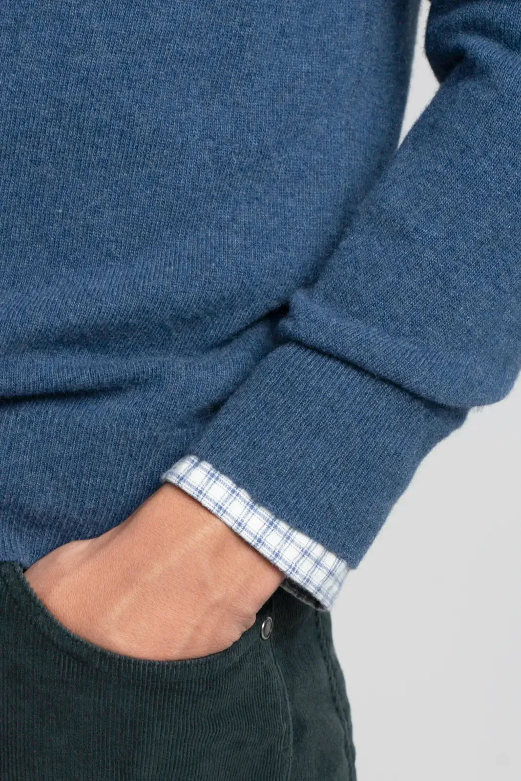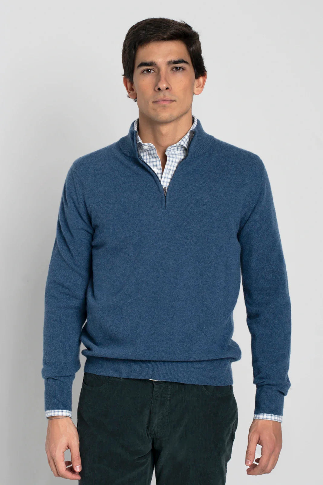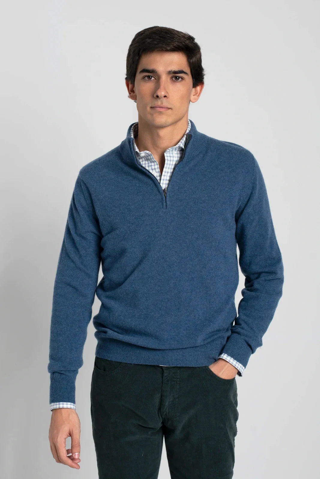 Jersey de lana con cuello chimenea y cremallera de un color azul que sienta muy bien. El interior del cuello esté tejido en gris oscuro.